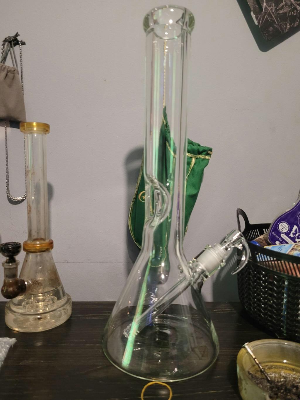 High quality thick glass. I love the downstem design makes the hits super smooth. I got a ash catcher with Mine absolutely necessary. Love the H logo having a branded bong just feels better.